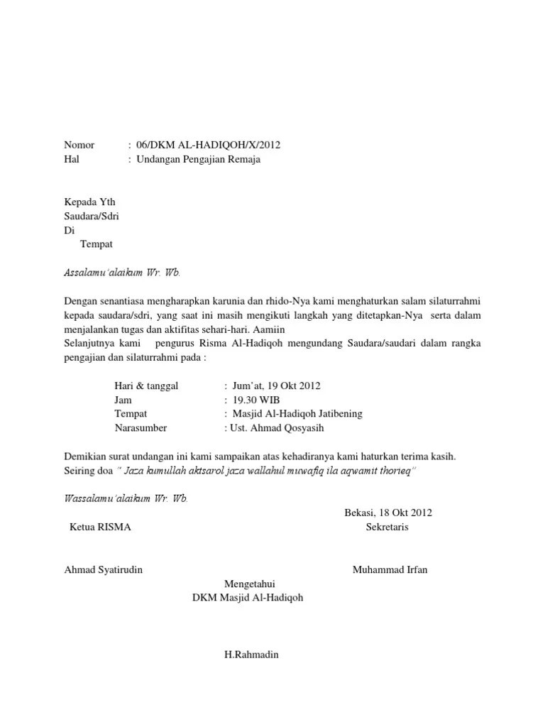 Contoh surat undangan rapat pengurus masjid, 28 09 2019 contoh surat undangan rapat bagi anda yang berkecimpung di dunia organisasi atau bekerja di salah satu perusahaan maupun instansi pemerintahan tentu sudah tidak asing lagi dengan surat undangan rapat rapat memang memiliki peranan yang. Contoh surat undangan remas remaja masjid ini adalah format surat udangan untuk remaja masjid untuk bisa menghadiri forum atau silaturahmi remaja masjid di tempat anda sehingga bisa membahas tentang kemajuan untuk bisa menjadi remaja yang beragu didalam agam islam dan memberikan banyak. 15 contoh surat undangan resmi tidak resmi rapat. Text of contoh surat takmir masjid. Teks undangan takmir dan pengurus masjid